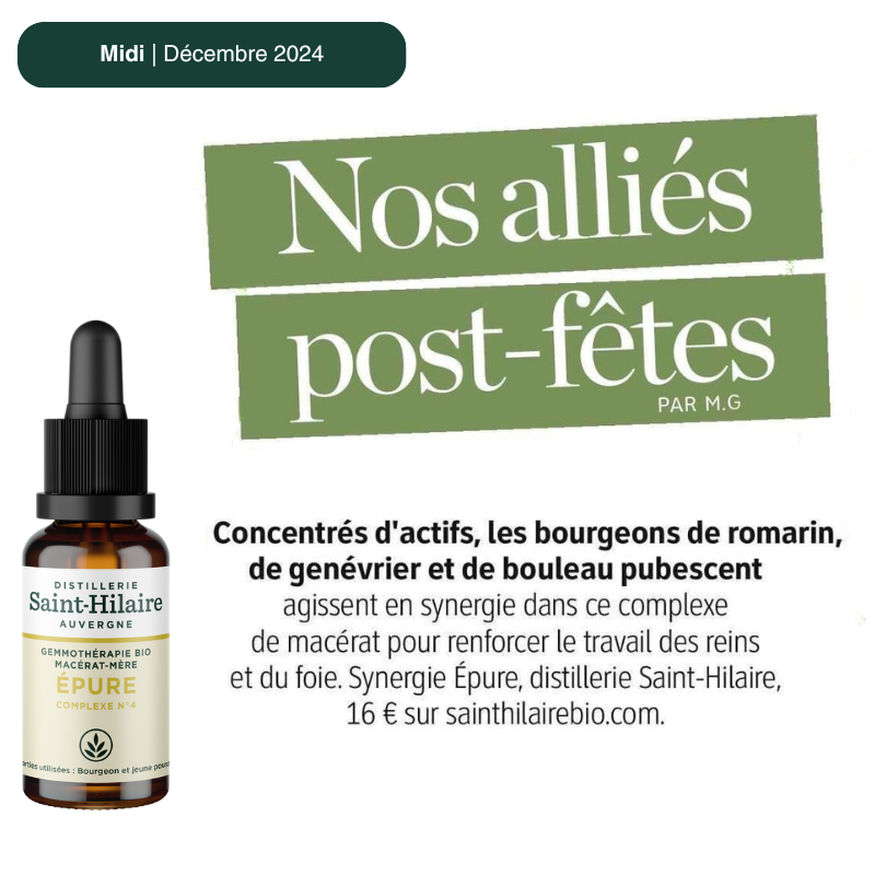Le complexe de macérat-mère bio Épure combine les extraits de bourgeons de Romarin, de Genévrier et de Bouleau pubescent, soigneusement sélectionnés pour leur complémentarité. Inspiré par les principes de la gemmothérapie, ce mélange végétal s'intègre dans démarche de routine bien-être, particulièrement appréciée au mois de janvier par exemple après la période des repas copieux lié aux fêtes de fin d'année. Grâce à cette formule, le complexe Épure participe à une approche douce et naturelle du bien-être intérieur.